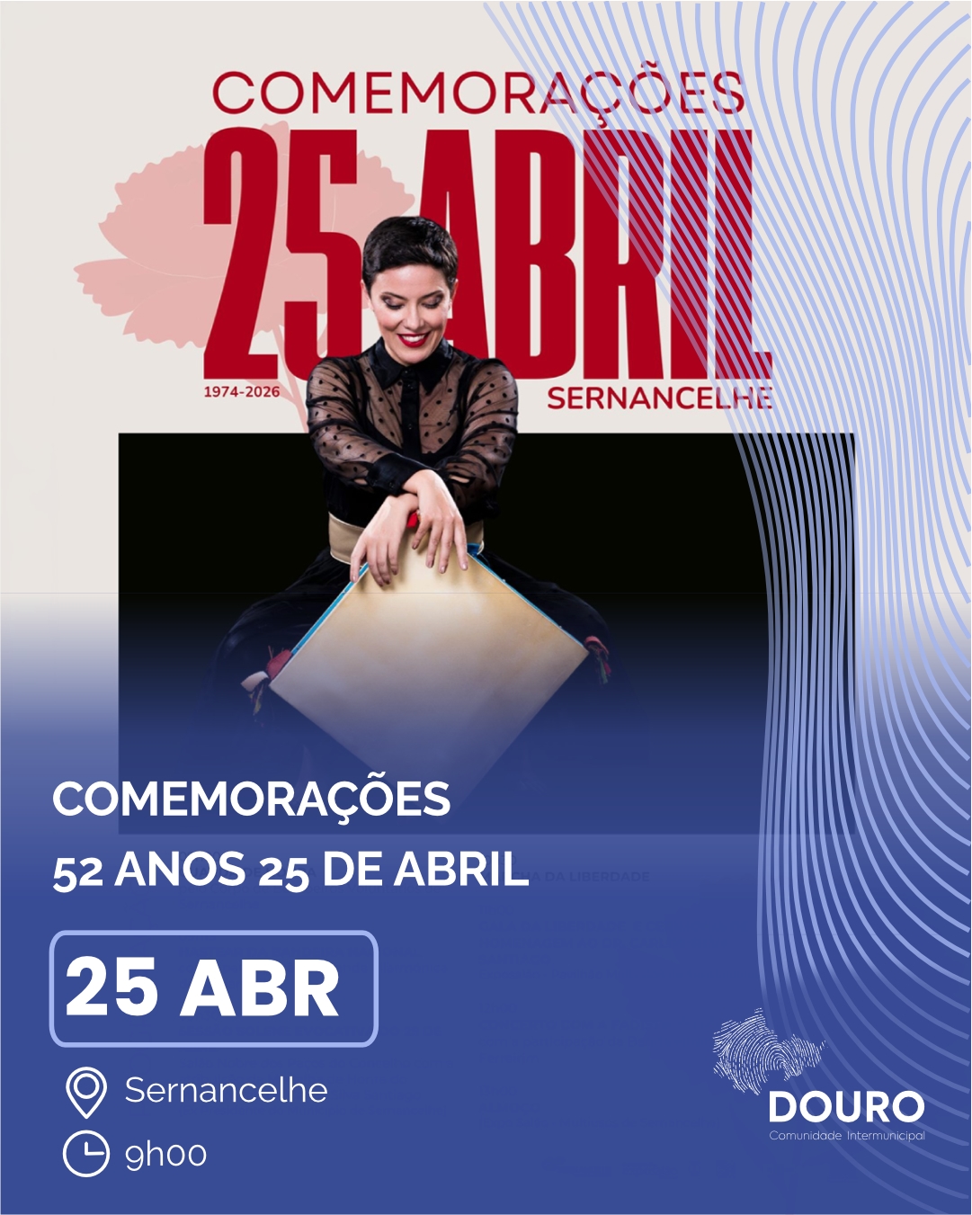 Home Eventos 52º aniversário do 25 de abril 52º aniversário do 25 de abril No dia 25 de abril junte-se a nós e venha celebrar a liberdade em Sernancelhe com um Concerto de ANA LAÍNS com a participação da Banda Musical de Ferreirim Contamos com a sua presença. + Adicionar ao Calendário Google + iCal / Outlook ics 00 dias 00 Horas 00 minutos 00 segundos Data Abr 25 2026 Hora 9:00 Local Sernancelhe Próximo Evento CONCURSO INTERNACIONAL DE CARICATURAS DE CAMILO CASTELO BRANCO Data Abr 06 2026 - Mai 04 2026 Partilhar este evento Pesquisar por: Artigos recentes Reunião nº 197 do Conselho Intermunicipal da CIM Douro 23 de Abril, 2026 Miradouro do Imaginário 16 de Abril, 2026 Projeto ESGROWTH – 1ª Reunião em Valladolid 13 de Abril, 2026 REINO MARAVILHOSO – EPISÓDIO 17 13 de Abril, 2026 Casa do Douro 9 de Abril, 2026 CategoriasCIMDOURO (179) CIM Magazine (5) Discover Douro (3) Douro (7) Eventos (19) Lendas (21) noticias (200) Personalidades do Douro (13) Pontos de Interesse (33) Reino Maravilhoso Podcast (17) Sem categoria (33) Uncategorized (3) Vila Real (4) Arquivo Arquivo Seleccionar mês Abril 2026 (7) Março 2026 (16) Fevereiro 2026 (12) Janeiro 2026 (26) Dezembro 2025 (5) Novembro 2025 (4) Outubro 2025 (1) Setembro 2025 (3) Agosto 2025 (3) Julho 2025 (5) Junho 2025 (4) Maio 2025 (8) Abril 2025 (5) Março 2025 (8) Fevereiro 2025 (13) Janeiro 2025 (12) Dezembro 2024 (9) Novembro 2024 (24) Outubro 2024 (21) Setembro 2024 (9) Agosto 2024 (10) Julho 2024 (15) Julho 2023 (2) Junho 2023 (1) Janeiro 2023 (2) Outubro 2022 (1) Agosto 2022 (5) Janeiro 2022 (1) Dezembro 2021 (1) Outubro 2021 (2) Setembro 2021 (1) Julho 2021 (4) Junho 2021 (5) Maio 2021 (2) Abril 2021 (2) Março 2021 (3) Fevereiro 2021 (2) Janeiro 2021 (4) Dezembro 2020 (3) Novembro 2020 (2) Outubro 2020 (6) Setembro 2020 (4) Julho 2020 (1) Junho 2020 (2) Maio 2020 (3) Abril 2020 (1) Março 2020 (1) Janeiro 2020 (1) Dezembro 2019 (2) Outubro 2019 (2) Setembro 2019 (1) Julho 2019 (1) Junho 2019 (1) Abril 2019 (1) Fevereiro 2019 (1) Janeiro 2019 (1) Dezembro 2018 (1) Outubro 2018 (3) Setembro 2018 (2) Agosto 2018 (1) Maio 2018 (1) Abril 2018 (4) Janeiro 2018 (1) Dezembro 2017 (1) Novembro 2017 (1) Agosto 2017 (1) Maio 2017 (1) Outubro 2016 (1)