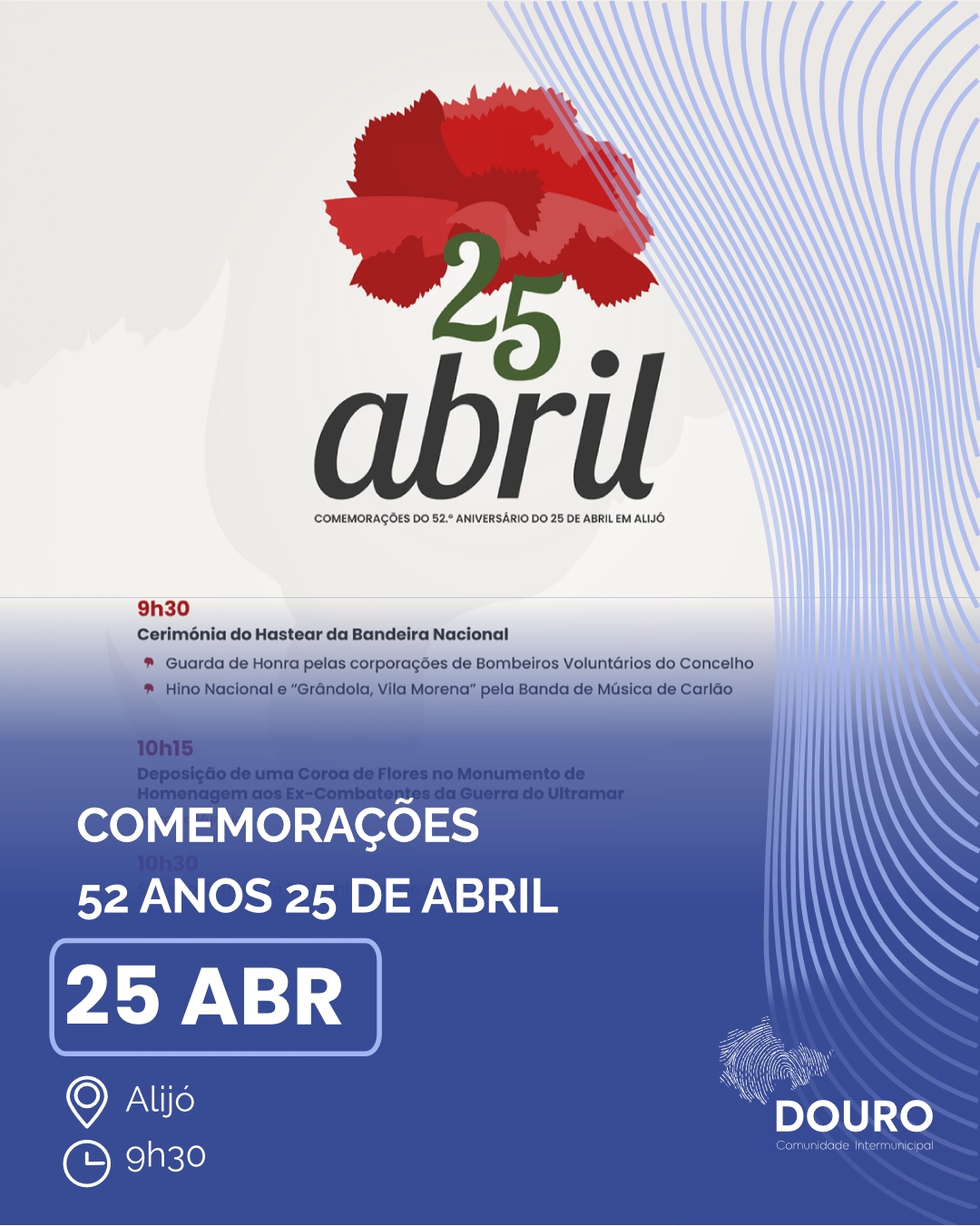 O Município de Alijó assinala o 52.º aniversário do 25 de Abril com um conjunto de iniciativas solenes e culturais que evocam os valores da liberdade, da democracia e da memória coletiva. Toda a população está convidada a participar nas comemorações e a celebrar uma das datas mais importantes da história de Portugal.