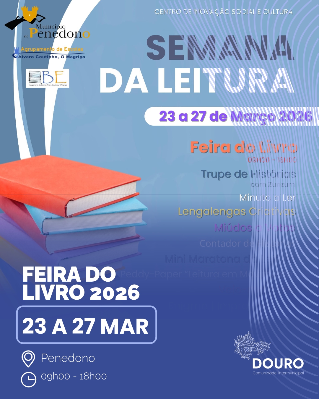 Home Eventos Semana da Leitura Semana da Leitura SEMANA DA LEITURA 2026 23 a 27 de março Centro de Inovação Social e Cultura de Penedono + Adicionar ao Calendário Google + iCal / Outlook ics Data Mar 23 - 27 2026 TERMINADO! Local Penedono Próximo Evento CONCURSO INTERNACIONAL DE CARICATURAS DE CAMILO CASTELO BRANCO Data Abr 06 2026 - Mai 04 2026 Partilhar este evento Pesquisar por: Artigos recentes Projeto ESGROWTH – 1ª Reunião em Valladolid 13 de Abril, 2026 REINO MARAVILHOSO – EPISÓDIO 17 13 de Abril, 2026 Casa do Douro 9 de Abril, 2026 CIM Douro Magazine – 3ª transmissão 7 de Abril, 2026 CIM Douro é notícia no Porto Canal 1 de Abril, 2026 CategoriasCIMDOURO (178) CIM Magazine (5) Discover Douro (3) Douro (7) Eventos (19) Lendas (21) noticias (199) Personalidades do Douro (13) Pontos de Interesse (32) Reino Maravilhoso Podcast (17) Sem categoria (33) Uncategorized (3) Vila Real (4) Arquivo Arquivo Seleccionar mês Abril 2026 (5) Março 2026 (16) Fevereiro 2026 (12) Janeiro 2026 (26) Dezembro 2025 (5) Novembro 2025 (4) Outubro 2025 (1) Setembro 2025 (3) Agosto 2025 (3) Julho 2025 (5) Junho 2025 (4) Maio 2025 (8) Abril 2025 (5) Março 2025 (8) Fevereiro 2025 (13) Janeiro 2025 (12) Dezembro 2024 (9) Novembro 2024 (24) Outubro 2024 (21) Setembro 2024 (9) Agosto 2024 (10) Julho 2024 (15) Julho 2023 (2) Junho 2023 (1) Janeiro 2023 (2) Outubro 2022 (1) Agosto 2022 (5) Janeiro 2022 (1) Dezembro 2021 (1) Outubro 2021 (2) Setembro 2021 (1) Julho 2021 (4) Junho 2021 (5) Maio 2021 (2) Abril 2021 (2) Março 2021 (3) Fevereiro 2021 (2) Janeiro 2021 (4) Dezembro 2020 (3) Novembro 2020 (2) Outubro 2020 (6) Setembro 2020 (4) Julho 2020 (1) Junho 2020 (2) Maio 2020 (3) Abril 2020 (1) Março 2020 (1) Janeiro 2020 (1) Dezembro 2019 (2) Outubro 2019 (2) Setembro 2019 (1) Julho 2019 (1) Junho 2019 (1) Abril 2019 (1) Fevereiro 2019 (1) Janeiro 2019 (1) Dezembro 2018 (1) Outubro 2018 (3) Setembro 2018 (2) Agosto 2018 (1) Maio 2018 (1) Abril 2018 (4) Janeiro 2018 (1) Dezembro 2017 (1) Novembro 2017 (1) Agosto 2017 (1) Maio 2017 (1) Outubro 2016 (1)